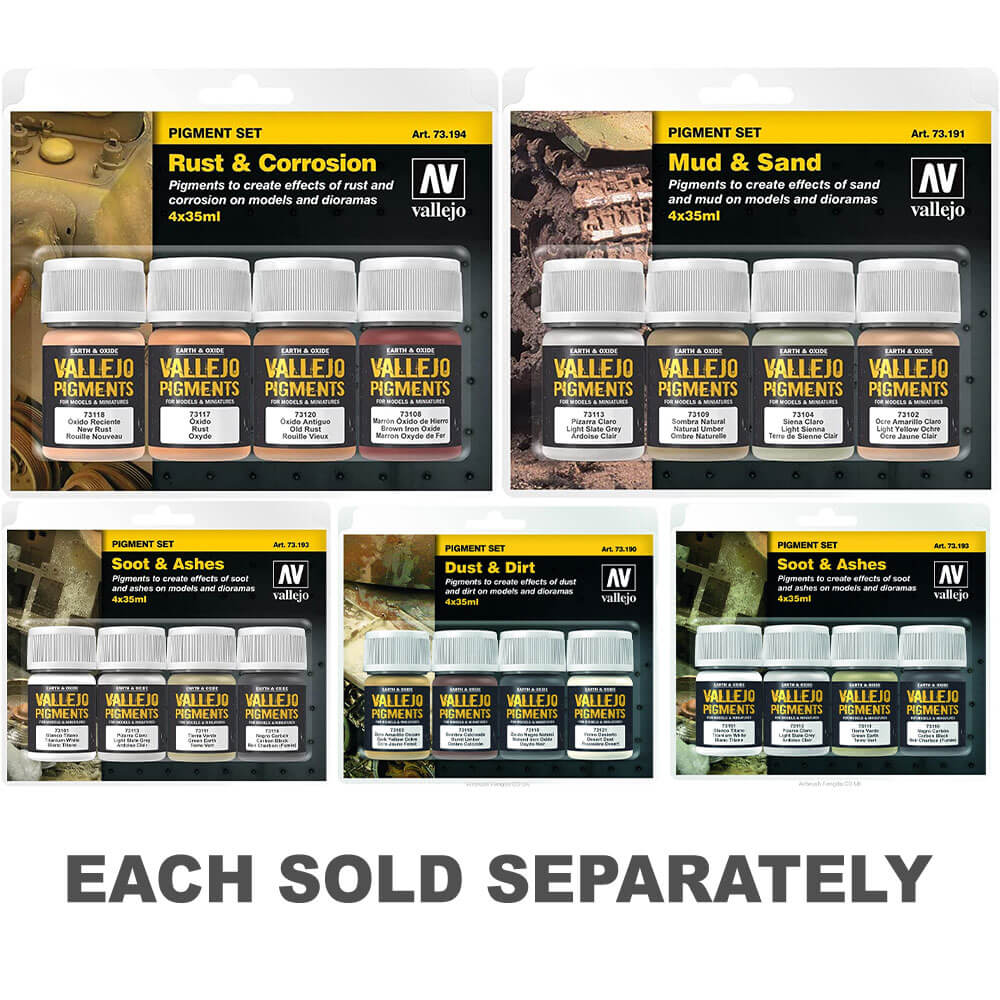 - De Vallejo -pigmenten, een selectie van natuurlijke aarde en synthetische pigmenten.