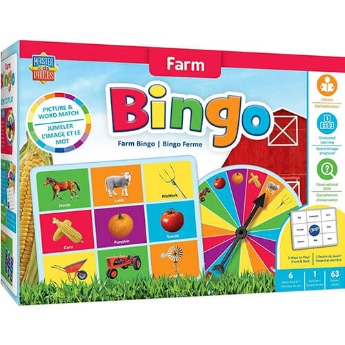 • 6 dobbeltsidede spilplader, 63 bingo-tokens og 1 spilspinner