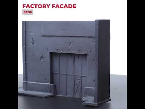 - Frontbillede af en fabrik, komplet med metaldøre og med et højt detaljerede niveauer i teksturerne på sidevæggene, perfekt til placering på en base sammen med køretøjer.