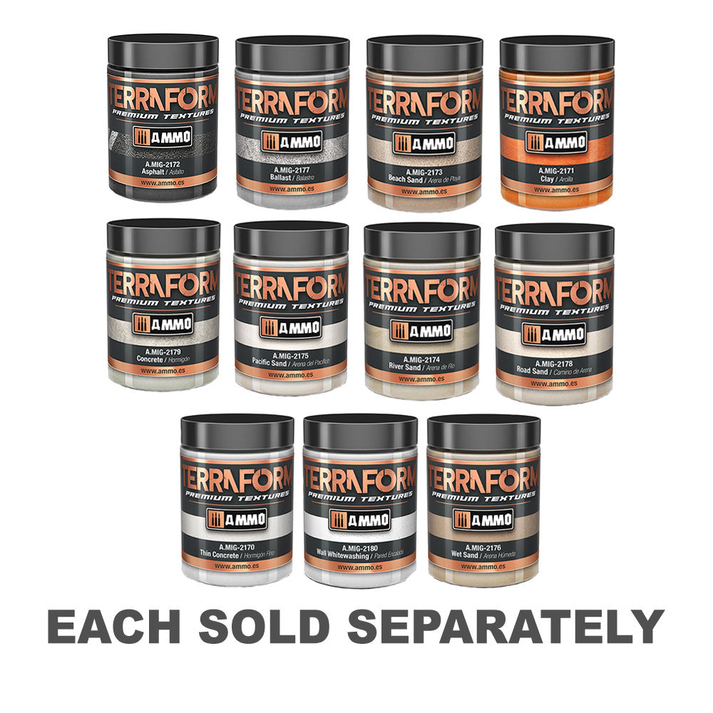 Mit dieser neuen Acrylformulierung aus natürlichen Mineralien können Sie eine Vielzahl von Texturen wie Beton, Sand, Asphalt, Ton und Schotter authentisch nachbilden. Dieses ungiftige und geruchlose Acrylprodukt wird in 100-ml-Kanistern angeboten. Es trocknet innerhalb von 24 Stunden vollständig und kann mit anderen ähnlichen Produkten aus unserem Textursortiment gemischt werden. Es ist für jeden Maßstab von 1/16 bis 1/48 geeignet.