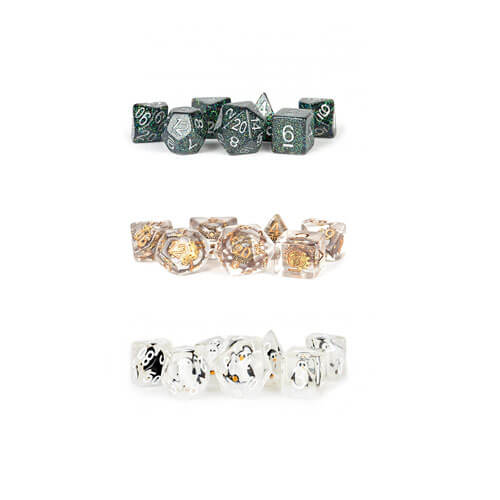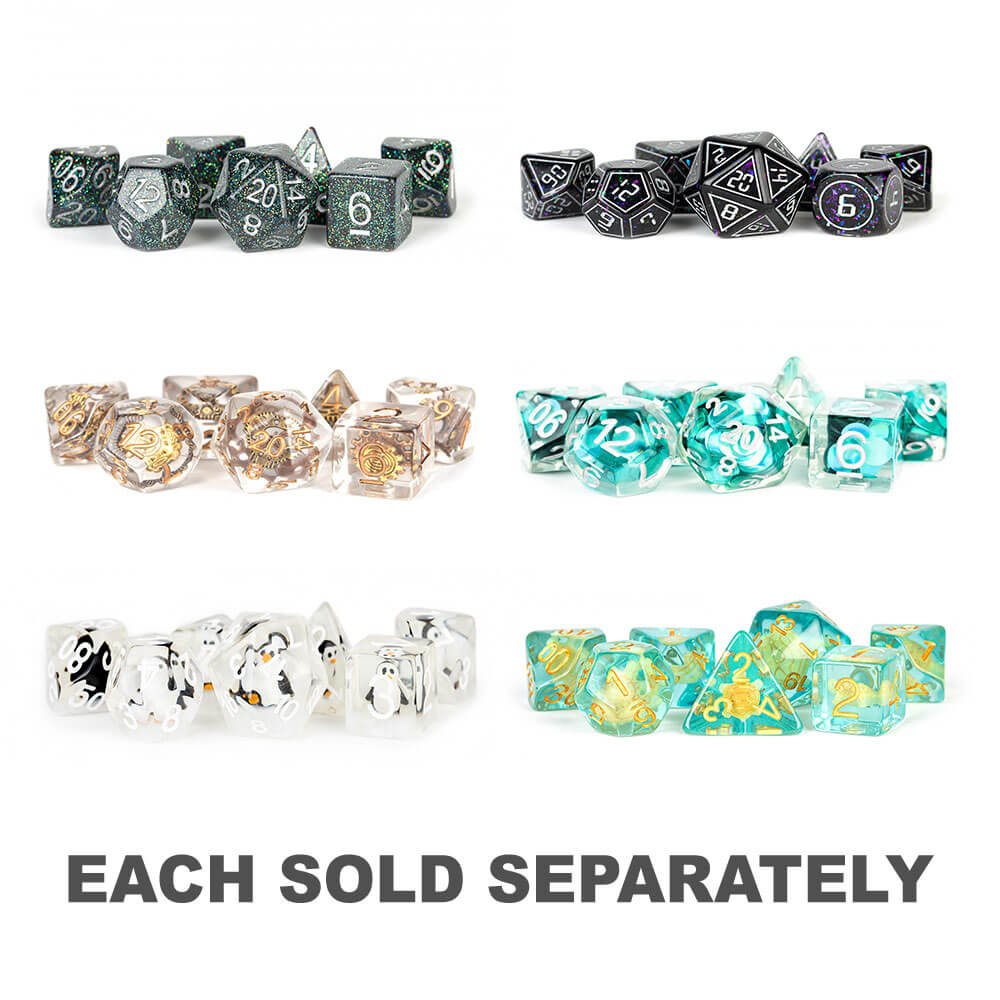 MDG resin dice have unique inclusions that add flare to any gaming table. These are full-sized 16mm polyhedral dice sets that come with 7 dice (d4, d6, d8, d10, d10%(00-90), d12, and d20).