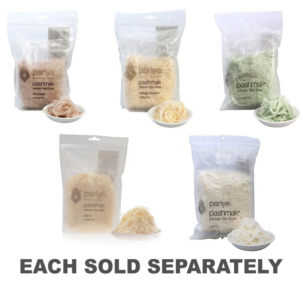 Delight in the harmonious blend of sweetness and nuttiness with Pariya Pashmak Fairy Floss in Pistachio flavor with this 200g. Also known as Persian cotton candy, Pashmak is a delicate and luxurious confection that melts in your mouth. Crafted with care, Pariya Pashmak offers a unique and melt-in-your-mouth experience infused with the rich taste of pistachios.
