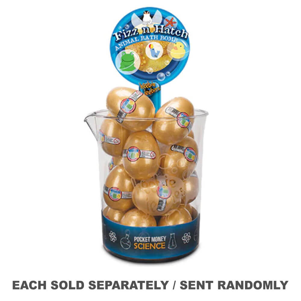Plaats deze gouden eierbadbom in water, kijk hoe het weg bruist en vind een verrassing van dierenspeelgoed erin.