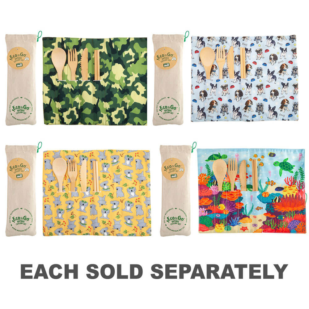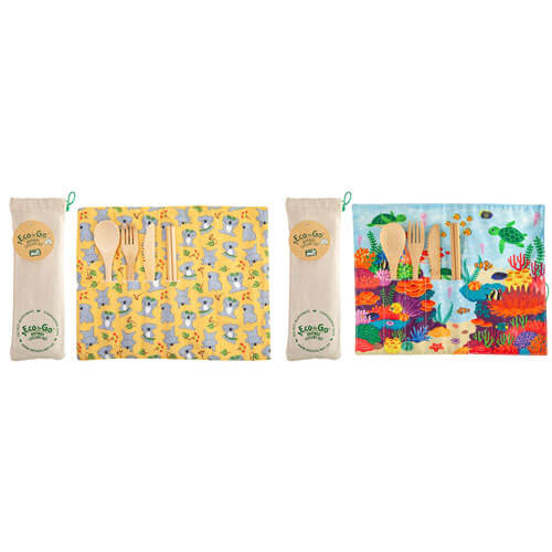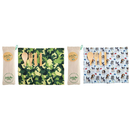 - Eco-vriendelijke bestek set gemaakt van bamboe, met een reisomslag die fungeert als een placemat.