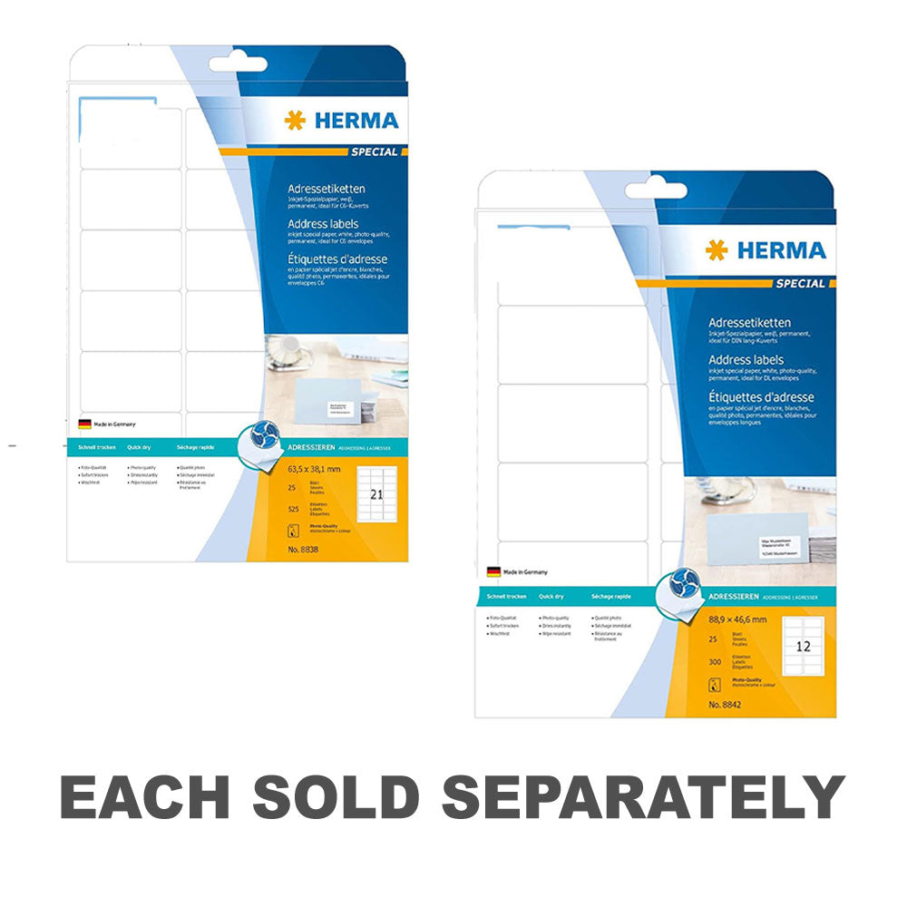 Streamline your mailing and shipping tasks with Herma Inkjet Address Labels! This pack of A4-sized labels includes 25 sheets, each featuring precise perforations for easy separation and a white finish for crisp, professional-looking prints. Designed specifically for inkjet printers, these labels ensure sharp, smear-free printing of addresses, logos, or barcodes, enhancing the presentation of your mailings. Whether for home or office use, these Herma labels offer reliability and convenience for all your address labeling needs. Get ready to elevate your mailing efficiency with Herma Inkjet Address Labels!