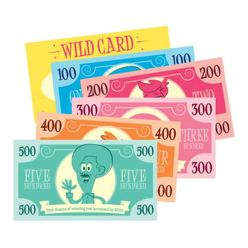 • COME GIOCHI? - Ad ogni turno, il giocatore 1 legge ad alta voce uno dei 180 domande divertenti, creative, personali e "caricate". Tutti gli altri scrivono una risposta personale alla domanda sul foglio delle risposte. Qualsiasi risposta farà! Il giocatore a destra del giocatore 1 raccoglie, mescola e legge ad alta voce le risposte. Il giocatore uno sceglie la sua risposta preferita e deve indovinare quale giocatore ha detto quale risposta. Il giocatore 1 raccoglie una carta monetaria per ogni partita corretta. Il giocatore che ha scritto la risposta preferita sceglie anche una carta di denaro. Ogni carta monetaria ha un valore in dollari di $ 100- $ 500 e i wild card sono miscelati