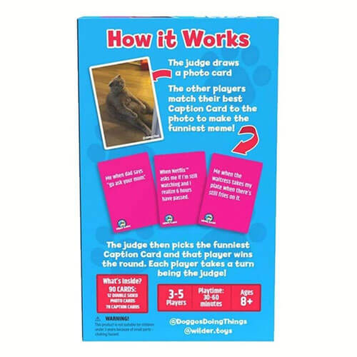 • Viene fornito con esilaranti schede fotografiche a doppia faccia e la più divertente carta della didascalia.