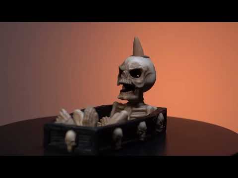 - スケルトンの頭に照らされた香コーンを置いて、煙が口から出てくるのを見る