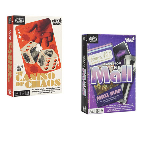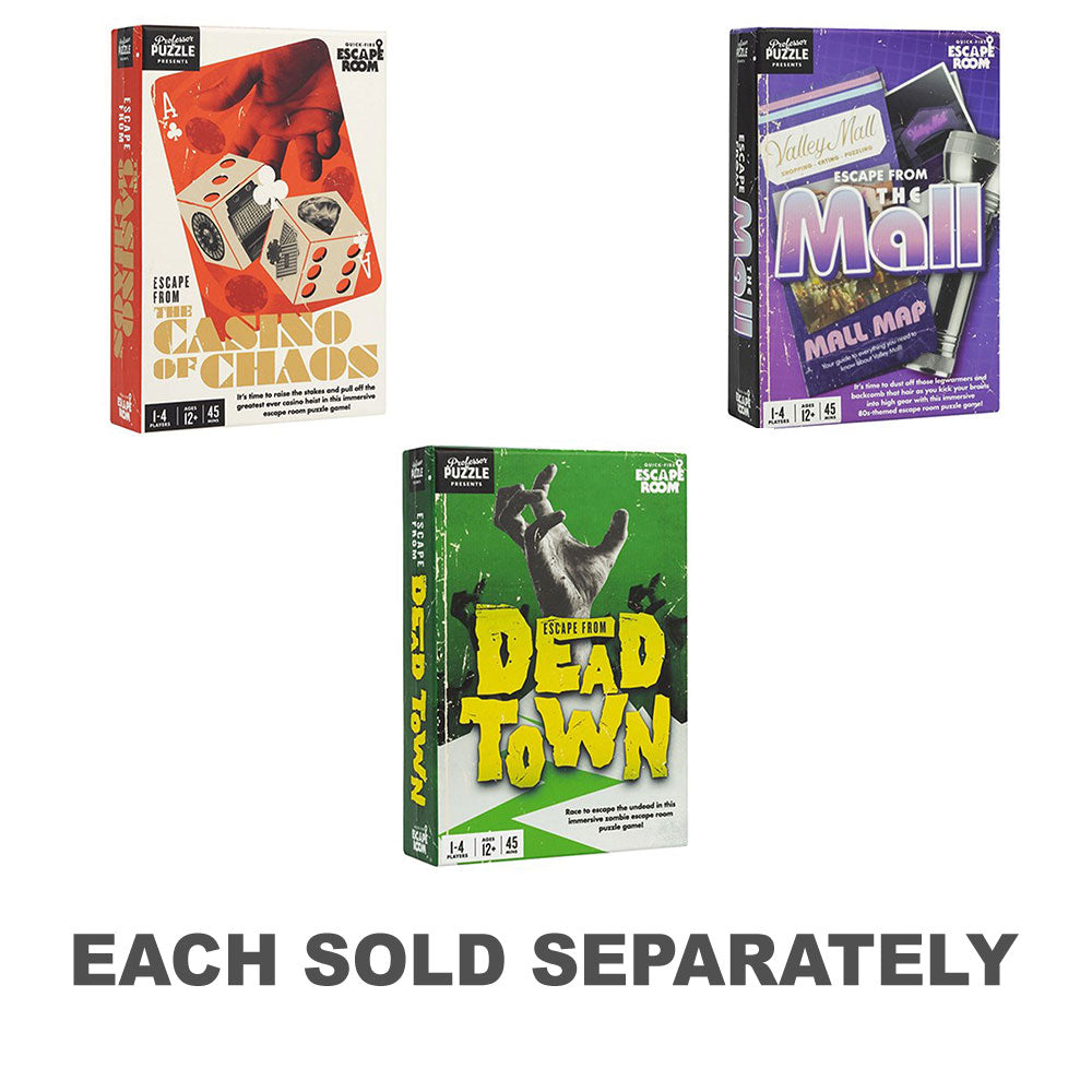 - ゲームが含まれます。セットには、4つのパズルエンベロープ、タウンマップ、指示、出口ブックレットが含まれています。