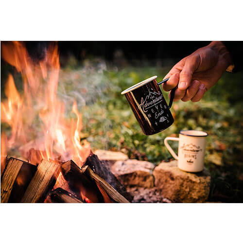 クラシック紳士のハードウェアエナメルマグカップの2つの背の高いバージョンのセット。クリームと黒が入っています。 「The Adventure Begins」と「The Adventure Never Ends」と書かれています。