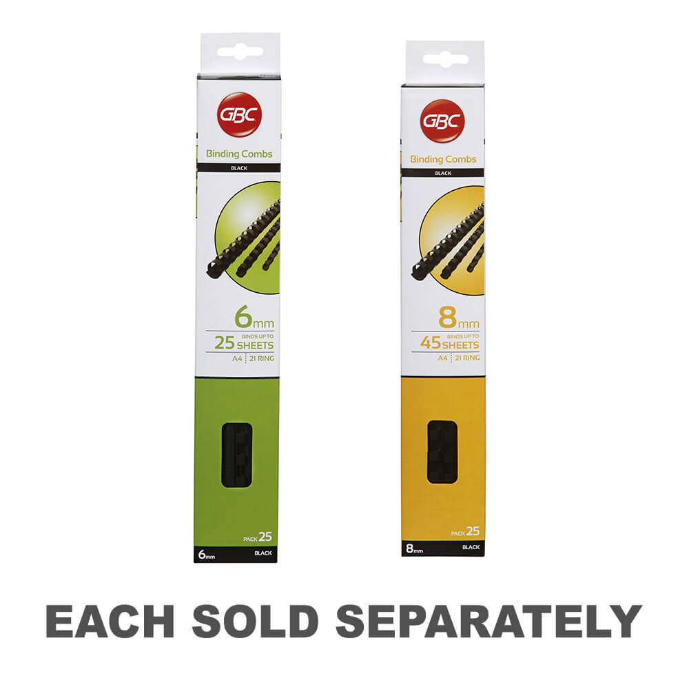 Te ławy wiązania plastikowego GBC są mocne i trwałe i dodają doskonałego akcentu do szeregu dokumentów, w tym prezentacji, raportów i projektów do użytku w szkole lub w biurze domowym. Grzebienia wiązania z tworzywa sztucznego 6 mm GBC mają 21 pętli, które bezpiecznie utrzymują do 25 arkuszy papieru A4.