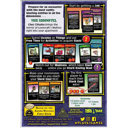 • Chez Cthulhu zawiera wszystko, co musisz zagrać, od razu po wyjęciu z pudełka: karty, tokeny dla luzu i szaleństwa oraz kości.