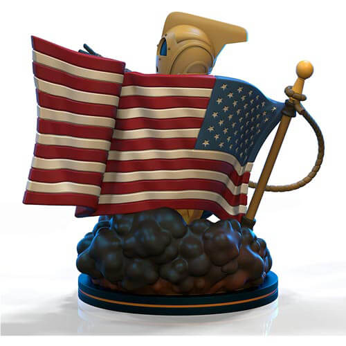 - De Rocketeer Q-Fig Elite staat 5 centimeter lang van de vurige diorama-displaybasis naar de top van de Amerikaanse vlag die achter onze held golpt.