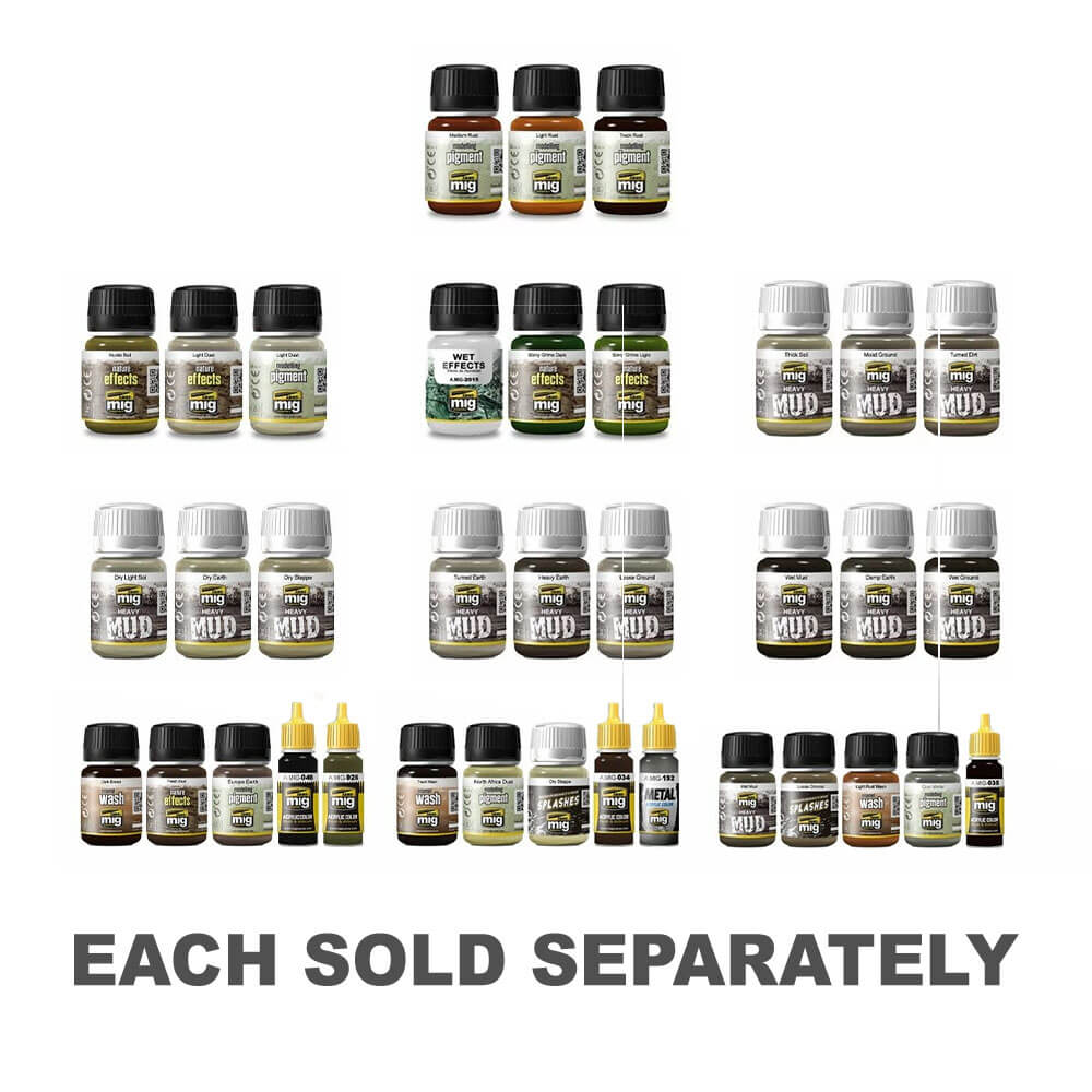 De pigmenten set die je moet geven om je kits de roestige look te geven die je wilt. Het bevat drie tonen; Een oranje pigment voor verse en recente roest (A.Mig Light Rust-3006), een donkere toon voor oudere roest (A.Mig Track Rust-3008) en een gemiddelde strakke roestkleur. (A.Mig -3005 Medium roest)