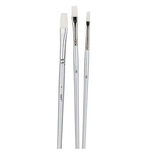 Student quality taklon flat brush with a short tapered handle and thick belly make it easy to hold and use. Metal ferrule. The soft, synthetic bristles make it suitable for acrylic, watercolour, gouache and craft paint. Durable, easy to clean, and retains shape.