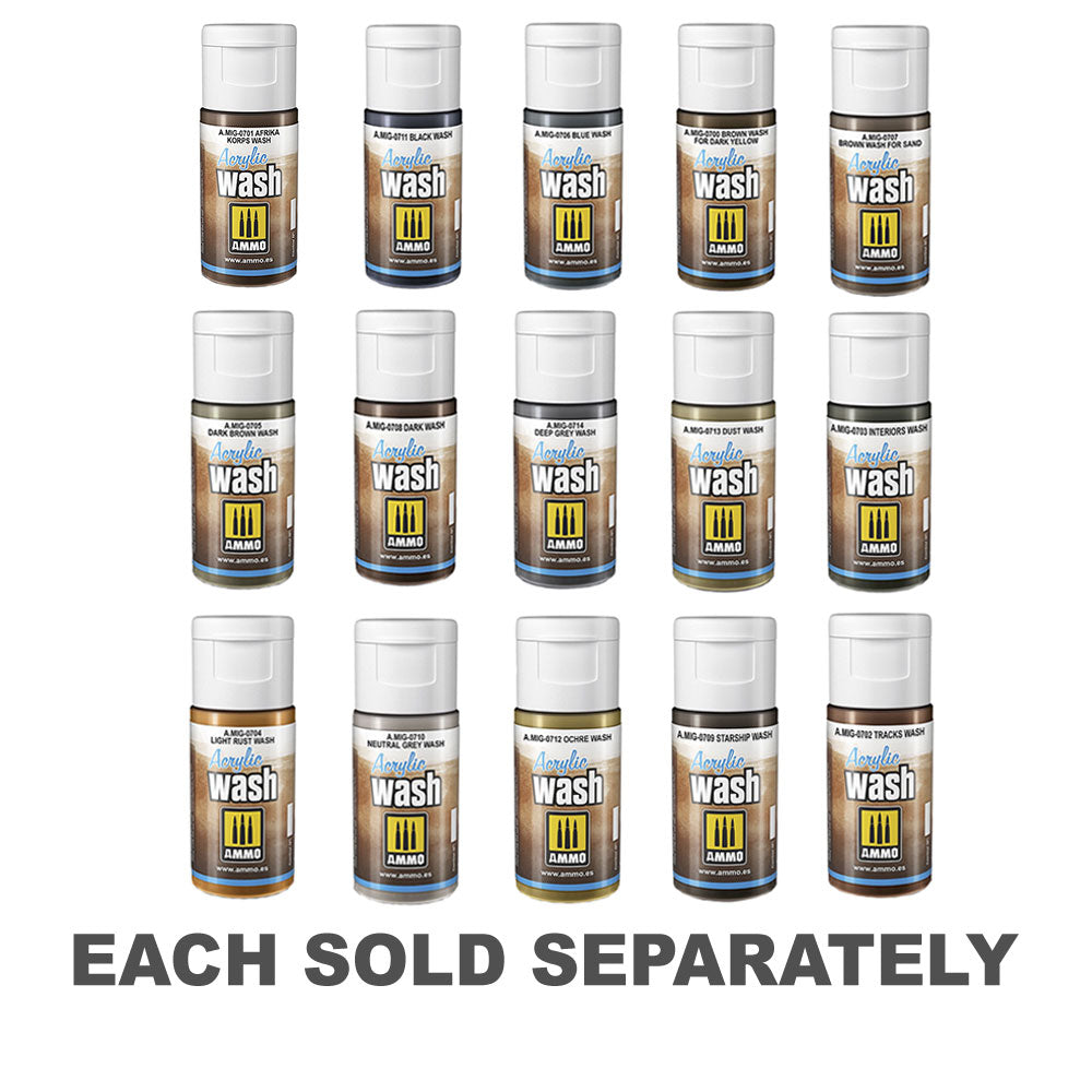 Washes är en av de äldsta och mest väsentliga modelleringsteknikerna som används av alla modeller på ämnen och dioramas av alla typer och teman. Utvecklad med två olika formuleringar för att inkludera både emaljstyp och akryltyp. Varje typ har olika egenskaper för att anpassa sig till de olika behoven hos våra modeller och preferenser för varje modeller efterfrågan. Båda erbjuder utmärkta resultat och är mycket enkla att tillämpa. Fördelen med akryltvätten är att den inte har någon toxicitet eller lukt så att använda den hemma eller nära din familj är inte ett problem, och det torkar snabbare än emaljtvätten som gör att du kan avsluta processen i en kortare mängd värderad tid . Akryltvätten finns i en flaska med en doseringslock som gör att du kan placera några droppar på en palett eller behållare för senare användning. Även om flaskans kapacitet är 15 ml, gör att dispensern kan spara produkt och arbeta med mer precision