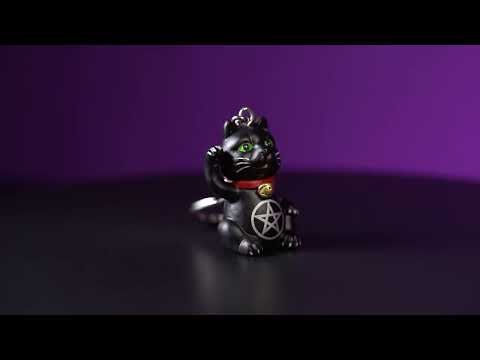 Mystisk nyckelring formad som en lycklig svart katt. Har livliga gröna ögon, en gyllene klocka och pentakeldesign på en traditionell nyckelringring