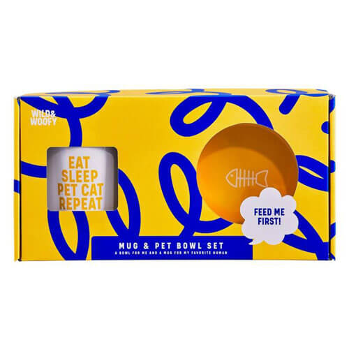 En gåva till mig och en gåva till min favorit människa! Denna kattmugg och skål som är uppsättning från Wild och Woofy är den perfekta gåvan för den oskiljaktiga mänskliga och kattduon. Keramisk mugg och stengodskålkatt presentuppsättning. Mugg läser "Eat Sleep Pet Cat Repeat" och skålen läser "Feed Me First". Förpackad i orange låda med blått fjädertryck.